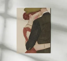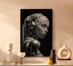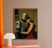 Questa scena surreale combina film noir e fantascienza. Una donna in abito rosso abbraccia un robot retrò in un interno arredato in stile classico: Edward Hopper incontra Fritz Lang. Lo stile pittorico iperrealistico e la calda combinazione di colori creano l'intimità nostalgica del realismo americano, mentre il tema solleva questioni assolutamente contemporanee. Quest'opera concettuale esplora il rapporto uomo-macchina con ironia poetica. Perfetto per chi apprezza l'estetica cinematografica, la profondità filosofica e la freddezza retrofuturistica.