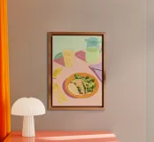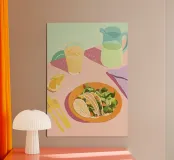 Questa vibrante illustrazione cattura un pasto delizioso in una composizione flat lay audace e geometrica. Tre appetitosi tacos e un'insalata fresca poggiano su un piatto arancione di grande effetto, su uno sfondo di blocchi di colore rosa brillante e verde menta. La scena è completata da una bevanda gialla rinfrescante e da una brocca di menta abbinata. Lo stile altamente grafico e la palette di colori ad alto contrasto rendono questo pezzo di Dopamine Decor perfetto per una cucina o una zona pranzo contemporanea. È un'allegra celebrazione del cibo e del colore. Provate l'eccellenza dell'arte digitale di alta qualità. Questo download è fornito
