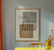 Arte digitale astratta caratterizzata da linee, forme organiche e geometriche con texture e pennellate nere nei toni tenui del marrone, del verde salvia e del beige. Arte moderna per interni essenziali, scandinavi, bohémien e boho. Godetevi l'arte digitale minimalista con forme e linee morbide.