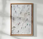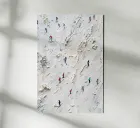 A dynamic aerial view of a winter ski resort, where skiers weave through the snow-covered mountain slopes. The energetic scene contrasts with the peaceful surroundings, highlighting the vastness of the resort and the sense of adventure. Bold brushstrokes create texture and movement, immersing the viewer in the thrill of winter sports.