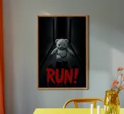 Orsacchiotto minaccioso in un corridoio buio con testo RUN pannello forex