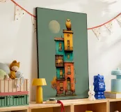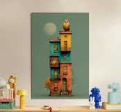 Un'opera d'arte stravagante e verticale di una stretta villetta a schiera dai colori vivaci, illuminata dolcemente dall'interno e coronata da un gufo gigante appollaiato sul tetto sotto la luna piena. I libri riempiono gli scaffali dei balconi, le zucche allineano i gradini e il caldo bagliore della sera porta mistero e fascino. Un'opera surreale e narrativa, perfetta per gli amanti della fantasia e dell'architettura.