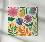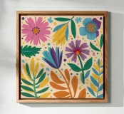 Una bella macchia di fiori selvatici stilizzati e stravaganti è illustrata in un affascinante stile ispirato all'arte popolare, con un delizioso mix di colori e forme che irradiano gioia e bellezza naturale.