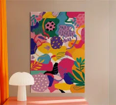 Una bella macchia di fiori selvatici stilizzati e stravaganti è illustrata in un affascinante stile ispirato all'arte popolare, con un delizioso mix di colori e forme che irradiano gioia e bellezza naturale.