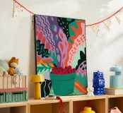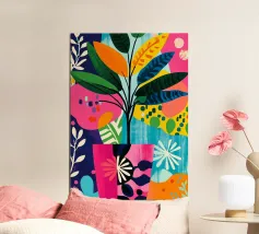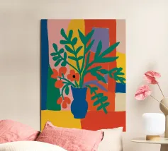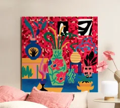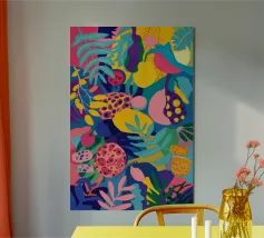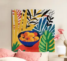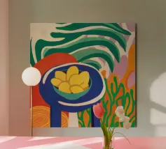 Una composizione astratta presenta una ciotola di fragole in mezzo a un turbinio di forme e motivi organici e colorati, creando un'interpretazione fresca e moderna di un classico dell'estate.