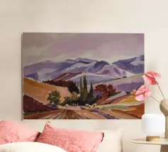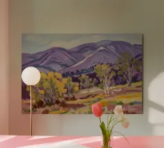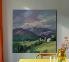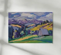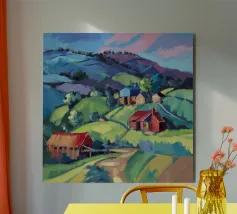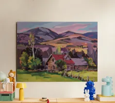 Un pittoresco paesaggio autunnale che raffigura un villaggio o una fattoria adagiata su una collina, circondata da un mosaico di alberi colorati nei toni dell'arancione e del giallo e da campi coltivati, con le lontane montagne blu a completare la scena.