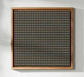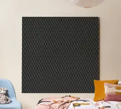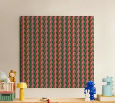 Un motivo ripetuto di linee diagonali e forme geometriche in vari colori. Il disegno utilizza tonalità audaci e contrastanti per creare un effetto visivo vibrante.