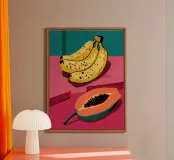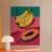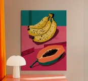 Un'illustrazione audace e ispirata alla pop art di banane e papaya su un piatto rosso brillante. I colori ad alto contrasto e lo stile grafico creano una dichiarazione vibrante e giocosa.