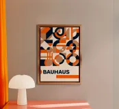 Un poster verticale visivamente accattivante, caratterizzato da un complesso mosaico modulare di forme geometriche interconnesse, tra cui cerchi, archi, quadrati e triangoli. Il design è un forte omaggio al Bauhaus e utilizza una palette calda e sofisticata di blu navy intenso, arancione brillante e tan/taupe, su uno sfondo color crema. La composizione è sostenuta dalla tipografia "BAUHAUS" in grassetto e in maiuscolo e dagli accenti arancioni in basso. Questo file digitale di qualità eccezionale (7000x5000 pixel, 300 dpi) è perfetto per un'arte murale modernista ad alta risoluzione che emana eccellenza nel design.