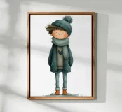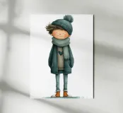 Questo poster morbido e caldo per la cameretta di un bambino presenta un ragazzino vestito con un cappello a pompon, una grande sciarpa e un cappotto, tutti nei toni del blu-verde. Il suo tenero sorriso e lo stile acquerellato aggiungono un'atmosfera rilassante e invernale alla decorazione murale. Perfetta per la cameretta di un bambino o di una bambina, questa illustrazione poetica aggiunge un tocco di morbidezza, modernità e comfort. È ideale anche come regalo per il bambino.