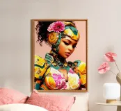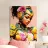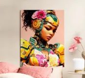 Una giovane e graziosa donna indossa abiti colorati e futuristici che sottolineano la sua vivace personalità. Il suo sguardo è pensieroso e fisso sul pavimento, come se fosse persa nei suoi pensieri. La scena irradia calma, malinconia e tranquilla introspezione.
