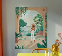 Una scena d'interni stravagante e astratta con una scala rosa, piante in vaso e un sole e una luna nel cielo visti attraverso un arco. L'opera d'arte è un paesaggio da sogno giocoso e bohémien.