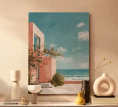 Una classica scena mediterranea che raffigura un edificio rosa con una scala che scende verso un tranquillo mare blu. Quest'opera d'arte cattura perfettamente il fascino solare e pacifico di un'isola greca.