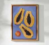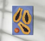 Una natura morta semplice ed elegante di una papaya tagliata a metà su un piatto blu intenso. La composizione minimalista e il sorprendente contrasto cromatico tra il frutto arancione e il piatto blu creano un pezzo moderno e sofisticato.
