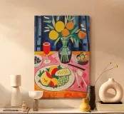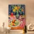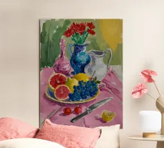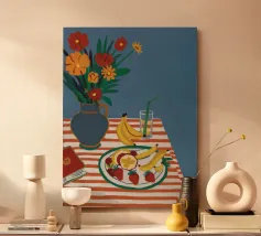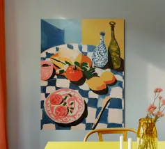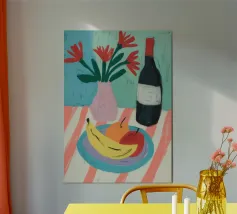 An elegant table set with a bowl of fruit, vibrant flowers and a wine glass creates a harmonious Mediterranean atmosphere. The contemporary painting and vibrant colours make this still life an eye-catcher in any room.