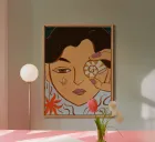 A woman holds a seashell to one eye, her gaze half-hidden, as if peering into the secret currents of the ocean. The piece is a love letter to intuition, mystery, and the ancient language of the sea, capturing the delicate dialogue between soul and water.