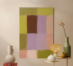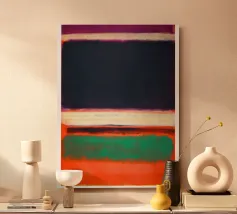 Inspired by the style of Mark Rothko, this abstract painting shows gently merging colour fields in violet, dark green and beige, which create a meditative and emotional mood. In the centre is a bright field that lends calm and depth to the composition. The minimalist and modern colour block arrangement invites the viewer to contemplate the pure effect of colour and form.