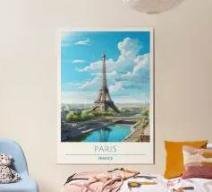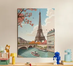 Questa rappresentazione iperrealistica della Torre Eiffel mostra la sua imponenza incorniciata da delicati fiori di ciliegio rosa in piena fioritura. L'immagine, ambientata in un cielo blu intenso punteggiato da soffici nuvole bianche, cattura il contrasto armonioso tra l'intricata struttura in ferro della torre e gli eterei petali. I fiori incorniciano la scena, attirando lo sguardo verso l'alto in direzione dell'iconica guglia, creando un'atmosfera romantica e sognante. Questa composizione serena incarna l'essenza del fascino parigino e del rinnovamento primaverile.