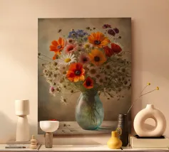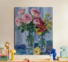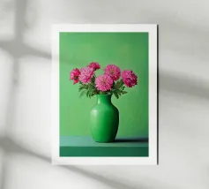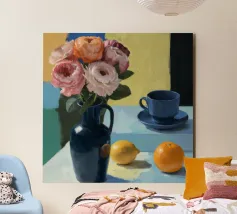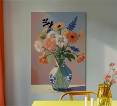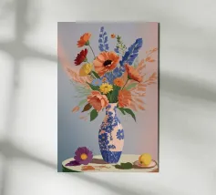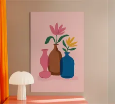 Elegante poster di natura morta con vasi in ceramica dai toni pastello riempiti di fiori sbocciati rosa e arancioni, su un morbido sfondo blu. Perfetto per aggiungere un tocco artistico e sereno agli interni moderni. Ideale per gli amanti dell'arte e dell'arredamento in cerca di ispirazione floreale.