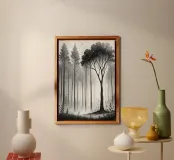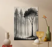 Portate la tranquillità in casa con questa stampa acquerellata monocromatica della foresta. Caratterizzata da fogliame a macchie d'inchiostro e alberi alti ed eleganti su uno sfondo nebbioso, quest'opera d'arte naturalistica astratta crea un'atmosfera calma e moderna.