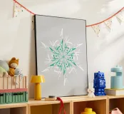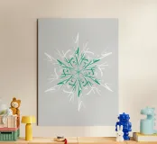 Design invernale: una stella dinamica a sei punte disegnata a mano in bianco e verde su uno sfondo grigio argento.