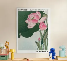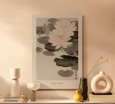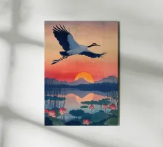 A woodcut with lotus leaves and water lilies on the shore, with a setting sun in a pale pink sky over a calm lake. An island can be seen on the horizon in the background, surrounded by trees and distant mountains. This artwork embodies the aesthetics of the Edo period and shows the simplicity of the woodcut techniques and the calm colours.