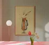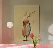 Un'affascinante illustrazione di un piccolo coniglio vestito per un'avventura autunnale. Avvolto in un'accogliente sciarpa e con uno zaino in spalla, questo dolce personaggio dei boschi cattura l'essenza della tranquilla esplorazione e del cambiamento stagionale. Con i suoi colori tenui e il suo tono nostalgico, quest'opera d'arte dona calore e fantasia a qualsiasi spazio, ideale per gli amanti della natura, i sognatori e gli appassionati di libri di fiabe.