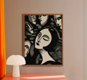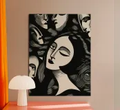 Estetica ipnotica della xilografia! Questa composizione drammatica mostra un volto femminile centrale circondato da spettatori anonimi. La magistrale tecnica del tratteggio e i radicali contrasti in bianco e nero ricordano le stampe espressioniste di M.C. Escher e Frans Masereel. Le molteplici prospettive e le diverse angolazioni creano una tensione inquietante: chi sta guardando chi? Le linee fluide e le volute ornamentali conferiscono all'opera un'eleganza Art Nouveau. Una potente meditazione sull'identità, l'anonimato e lo sguardo onnipresente degli altri.