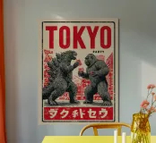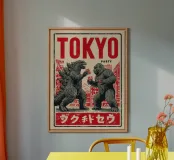 Una decostruzione ironica dei miti pop-culturali dell'orrore: nello stile di una linoleografia stampata a mano, l'opera combina l'estetica retrò dei vecchi manifesti giapponesi dei film di serie B e il fascino rustico della tradizione americana della xilografia. Godzilla e King Kong, i titani della distruzione, non sono qui in battaglia, ma in una posa assurda e amichevole, brindando con tazze rosse. La texture ruvida e le linee marcate danno energia all'immagine. Una dichiarazione audace e umoristica per i collezionisti che amano la forza grafica con un tocco di cultura pop.