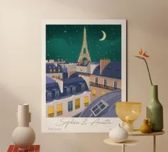 L'immagine mostra la Torre Eiffel in un cielo notturno di un blu intenso, con nuvole bianche, stelle scintillanti e una mezzaluna arancione. La torre stessa risplende nei toni caldi del giallo e dell'arancione e si staglia radiosa sullo sfondo scuro.