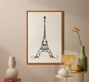 Il famoso simbolo di Parigi, la Torre Eiffel, in un design molto moderno. Lavoro artistico con elementi tipografici.