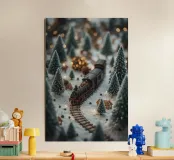 Treno in miniatura in un paesaggio innevato con alberi e luci pannello forex