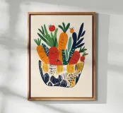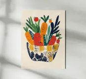 Un omaggio stilizzato alle meraviglie dell'orto. Con le sue tonalità calde e le texture audaci, questa illustrazione grafica sublima le forme e i colori degli ortaggi con una modernità abbagliante.