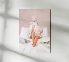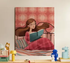In questa affascinante illustrazione, una dolce bambina si rilassa in un accogliente pigiama ricoperto di cuoricini, appollaiata su un divano imbottito. È assorta nel suo libro, con uno sguardo espressivo di curiosità e soddisfazione. Sopra di lei, una luce calda emana da un'elegante lampada, mentre una delicata tazza da tè si trova nelle vicinanze. Il testo scherzoso "Perché non posso leggere tutto il giorno?" sottolinea lo stato d'animo sognante della lettura e del tempo libero.
