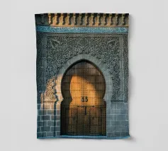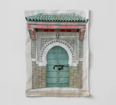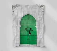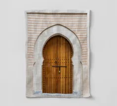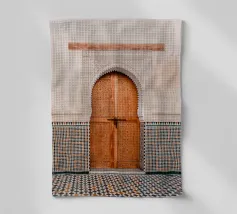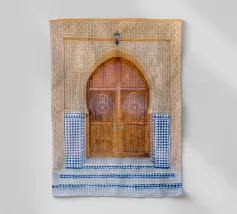 Architettura marocchina a Marrakech. Porta marrone con decorazioni intagliate e piastrelle colorate in nero, verde, arancio e blu.