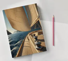Prospettiva coinvolgente dal ponte di una barca a vela, con vele beige finemente dettagliate che catturano la luce del sole. Il mare blu, dolcemente ondulato, si estende all'infinito, mentre le coste lontane appaiono sullo sfondo sotto un cielo limpido. Un invito a navigare e a sentire la libertà dell'oceano.