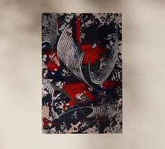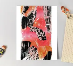 Questa opera d'arte astratta a collage è una miscela di vibrazioni retrò ed estetica surreale, con toni rossi e arancioni che creano un'atmosfera onirica. È un mix di familiare e inaspettato, perfetto per chi ama un tocco di nostalgia con un tocco moderno.