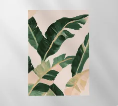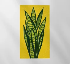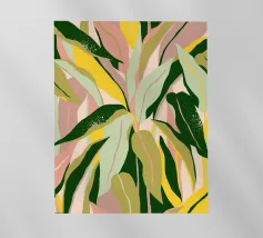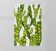 I motivi geometrici astratti a strisce verdi e gialle creano un senso di movimento nella composizione. Il disegno presenta elementi verticali di forma irregolare che suggeriscono un tema naturale.
