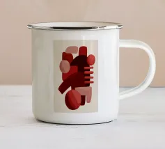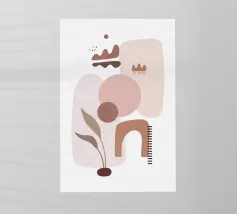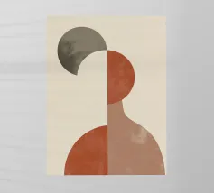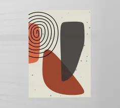Forme geometriche astratte nei toni del rosso e del marrone si sovrappongono e interagiscono tra loro, creando una composizione dinamica. Le curve morbide e le linee rette si fondono armoniosamente su uno sfondo neutro.
