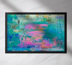 Le vibranti tonalità di rosa, blu e turchese si fondono in un vivace disegno astratto, creando un senso di movimento ed energia. I tratti audaci e i colori stratificati evocano un'atmosfera dinamica ed espressiva.