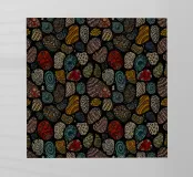 Un ricco motivo astratto con forme organiche e superfici strutturate in colori caldi come verde acqua, rosso ruggine, giallo oro, corallo, beige e blu su sfondo nero. Perfetto per gli amanti dell'arte astratta, gli appassionati di texture, i fan dei colori caldi e tutti coloro che apprezzano le forme organiche con dettagli artistici e la raffinatezza della terra.