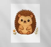 Un cartone animato dettagliato e commovente di un riccio paffuto che siede soddisfatto su un piccolo prato. I toni caldi e terrosi e il morbido sfondo beige conferiscono all'opera un'atmosfera da libro di fiabe; gli occhi lucidi, le guance rosee e gli aculei testurizzati del riccio lo rendono irresistibilmente adorabile. Piccole piante e un singolo fiore giallo incorniciano la scena, creando un'atmosfera accogliente e stravagante, perfetta per stampe da vivaio, adesivi e decorazioni per bambini.