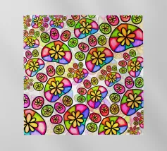 Un audace e vibrante motivo astratto con cerchi colorati, vortici e forme geometriche in ricche tonalità gioiello tra cui verde acqua, arancione, viola, giallo, magenta e marrone su sfondo nero. Questo energico disegno si ispira ai modelli tessili africani e all'arte etnica con la sua disposizione dinamica di motivi decorativi. Perfetto per gli amanti dell'arte culturale, per gli appassionati di motivi audaci e per tutti coloro che apprezzano i disegni vibranti di ispirazione etnica con il massimo impatto cromatico.