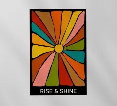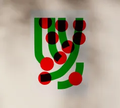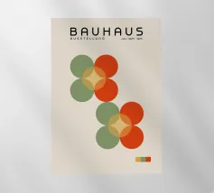 Un audace disegno astratto è caratterizzato da cerchi concentrici rossi e verdi, circondati da punti verdi. Due linee arancioni ondulate aggiungono un movimento dinamico alla composizione.