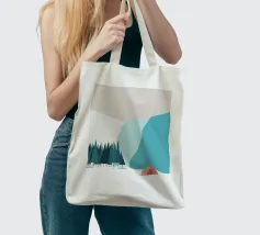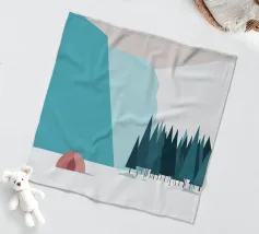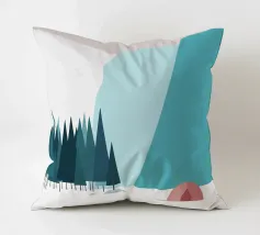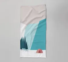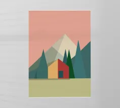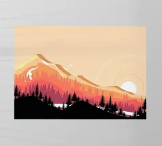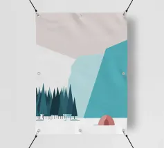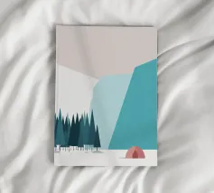 Illustrazione paesaggistica minimalista di una regione glaciale in Alaska: foreste di pini scuri, montagne innevate e una piccola tenda in primo piano. Questo poster cattura la natura selvaggia, la tranquillità e lo spirito avventuroso della natura nordamericana.
