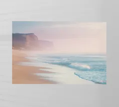 Questa tranquilla opera d'arte cattura un'alba mozzafiato su una spiaggia nebbiosa. Il cielo tenue e pastello e le onde delicate creano un'atmosfera rilassante e pacifica, perfetta per un arredamento ispirato al relax.