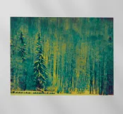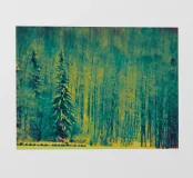 L'immagine mostra alberi innevati nella foresta, i colori sono stati modificati in modo estremo.