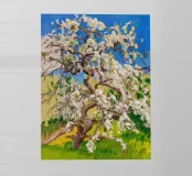 Un magnifico albero è ricoperto da una profusione di fiori bianchi o color avorio, i cui rami creano un bellissimo disegno intricato contro un cielo blu brillante, celebrando il culmine della primavera.