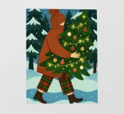Simpatica arte natalizia stravagante di una donna che trasporta il suo albero di Natale in una foresta innevata. L'albero di Natale è illuminato da luci fatate.