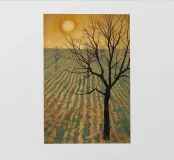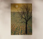 Albero spoglio in campo coltivato sotto un cielo dorato pellicola backlit